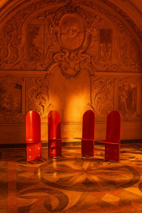 Les chaises sont fabriquées en bois laqué d’une teinte rouge vif brillante, un choix chromatique qui met en valeur leur forme et attire le regard, et qui est actuellement unique sur le marché. Les éléments structurels et les supports à la base sont en revanche en acier chromé, volontairement laissés visibles pour souligner le caractère industriel et expérimental du projet. Les boulons et les détails techniques exposés renforcent l’esthétique fonctionnelle et apportent une touche résolument contemporaine et avant-gardiste.