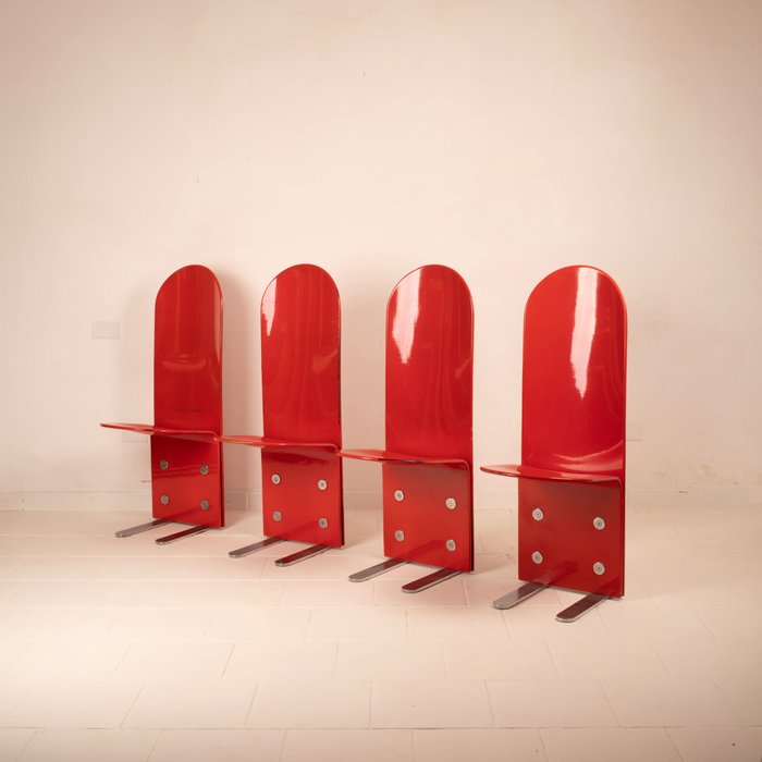 Ensemble extraordinaire de quatre chaises laquées rouges modèle Pellicano, conçues par Luigi Saccardo pour Arrmet et publiées dans Domus en 1975, véritables icônes du design radical italien des années soixante-dix.