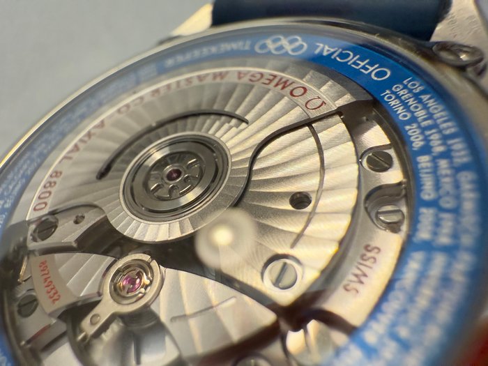 La finition est distinctement Omega : de larges vagues de Genève en arabesque, vis noircies, et un rotor gravé de références olympiques — excellence technique associée à une élégance discrète.